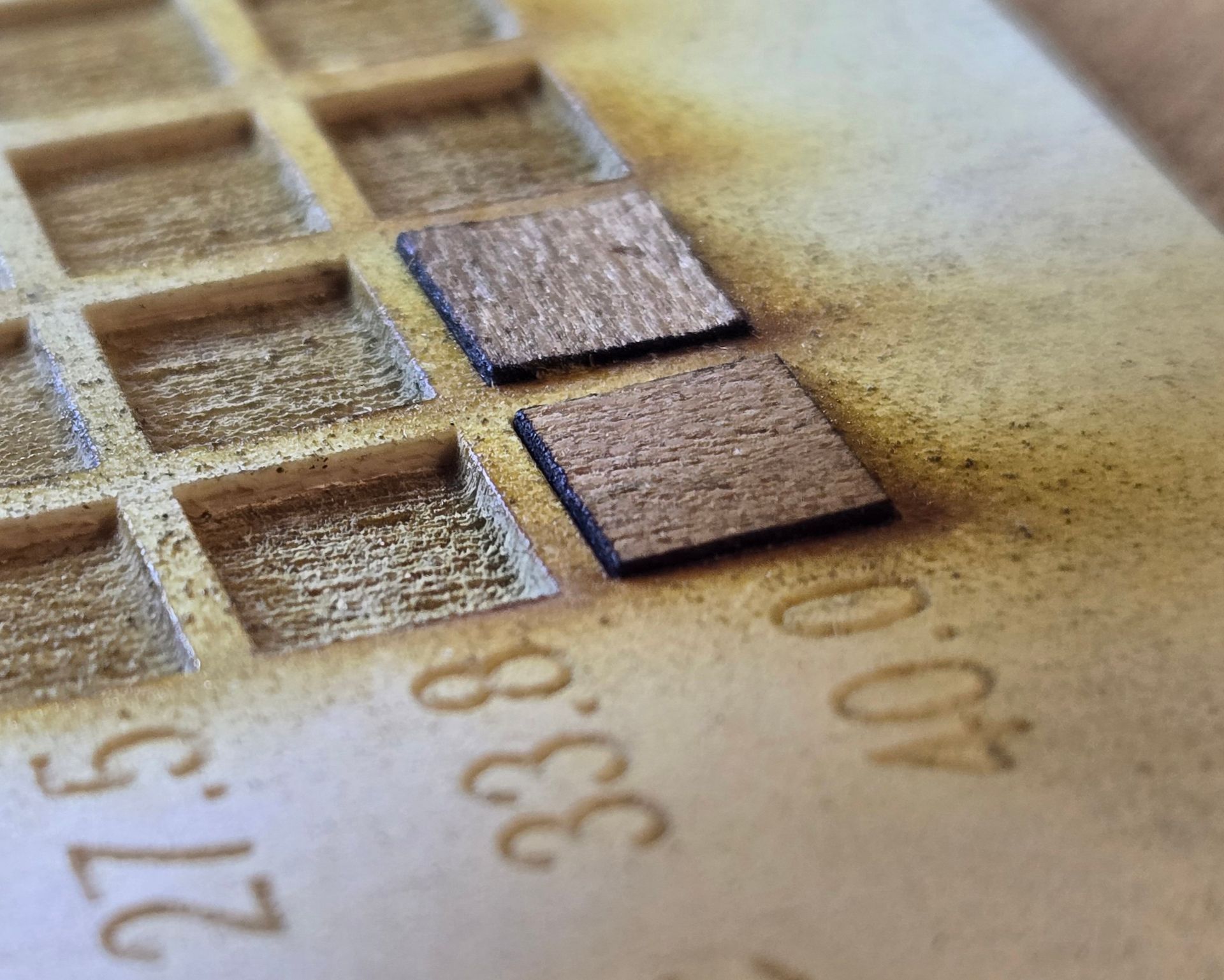 When testing your engraving settings, aim to have the cherry wood veneer protrude slightly above the surface of the Baltic birch base. This slight protrusion ensures that after sanding, the surface will be perfectly flush and smooth. Make sure to perform this test on a sample of your materials to find the exact depth and power settings that achieve this effect.