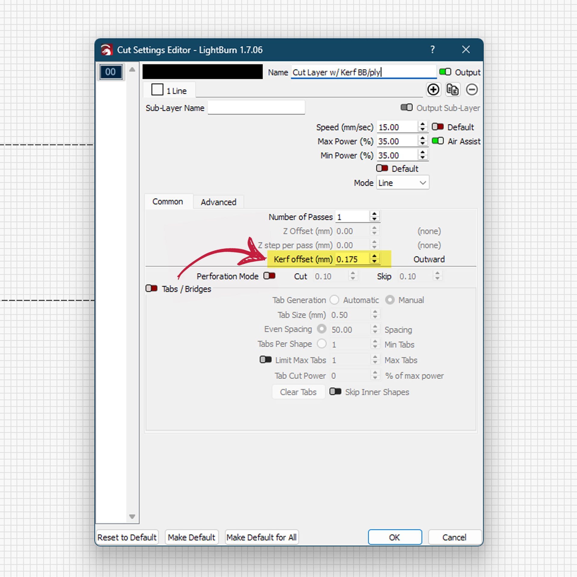 - How can LightBurn help adjust kerf size? Use LightBurn’s kerf offset feature in the cut settings editor to automatically adjust the laser path based on your kerf measurement, streamlining the cutting process for intricate designs like finger joints.
